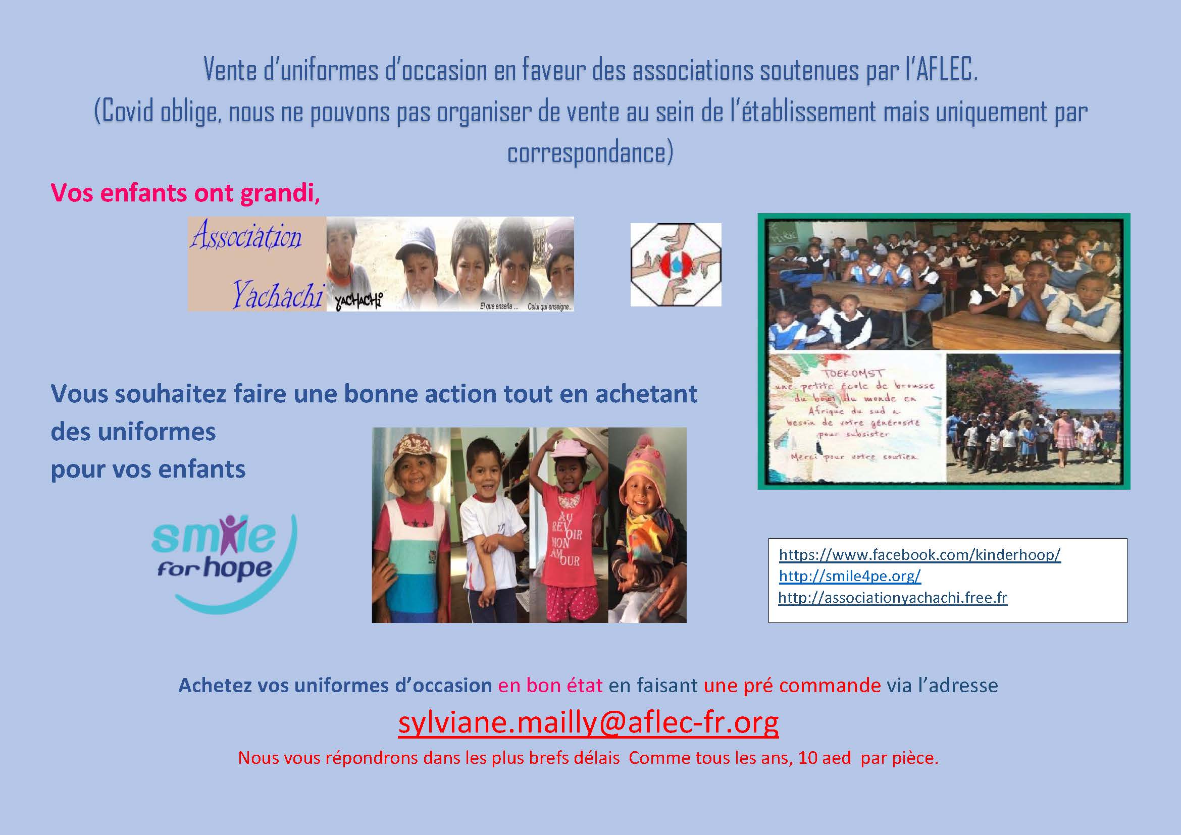 Vente d’uniformes d’occasion en faveur des associations soutenues par l’AFLEC. (Covid oblige, nous ne pouvons pas organiser de vente au sein de l’établissement mais uniquement par correspondance).