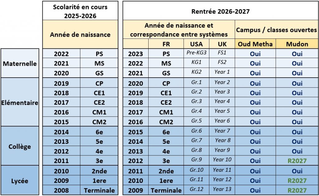 - Selon la règlementation émirienne, pour les élèves nés après le 31 août et jusqu’au 31 décembre, les parents devront signer une lettre de décharge, qui précise que si l’enfant est éventuellement transféré à l’intérieur des Emirats dans une école de cursus Américain ou Anglais, il devra redoubler sa classe. Ceci concerne les classes de Petite Section jusqu’au CP.